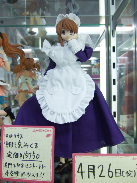 これは「涼宮ハルヒの憂鬱」の「朝比奈みくる」を、「キャラクターソング Vol.3」(AA)のジャケットでも着ている、劇中で着ていたメイド服姿でアクションフィギュアにしたもので、メガホビの商品説明によると「本格的なロングのメイド服に加えてカチューシャやミトン、さらに長門のメガネや、おなじみ「禁則事項です♪」のポーズを再現した手交換パーツも付属する豪華仕様となっている。遊び要素満載のキュートでグラマーな「みくるんるんメイド」をハルヒばりに堪能してみてはいかが?」と紹介されています。