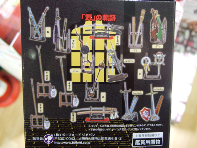 全15種+シークレット1種。この「世界の武具観賞用コレクションモデル・武-もののふ-第漆編」には、・鬼丸国綱(鎌倉鍛冶の礎を築いた一人、粟田口国綱の作刀)・数珠丸恒次(日蓮上人が護持刀として常に佩刀していたことで有名な太刀。)・袖搦・突棒・刺又(捕物三道具)などの他にも、インドの武器であるパタ・ジャマダハル(西洋ではカタールとも呼ばれる珍しい形状の刀剣)・コラ(インドのグルカ族が用いた刀剣)・マル(中心に円形の楯を備え、角を両端に持つインド固有の武器)や中華武器の鞭(一体型の棒)・青の剣(曹操が打たせたといわれる宝剣、その後趙雲の愛剣となる)・圏(突く・斬るのほかに敵の攻撃を受け止めることも可能な輪)・杵、さらに洋武器のアロンダイト(円卓の騎士ランスロット卿が振るったといわれる武器)・ガラティン(アーサー王に従う騎士、ガウェイン卿の愛剣)が、約3cmから約23cmにミニチュア化した状態でブラインドBOXに封入されている。