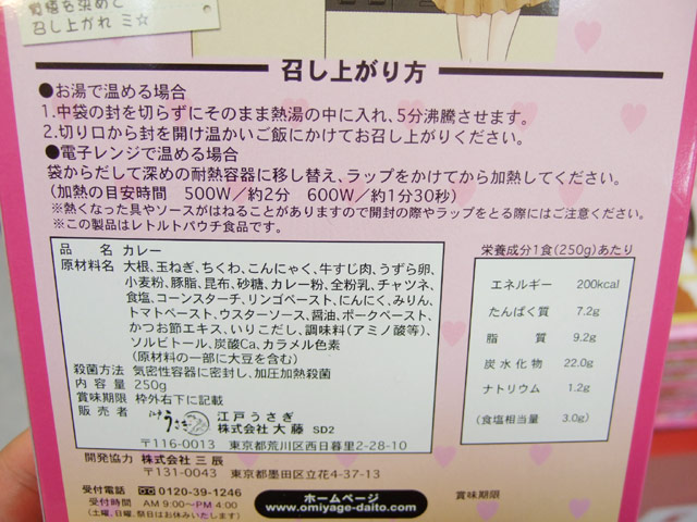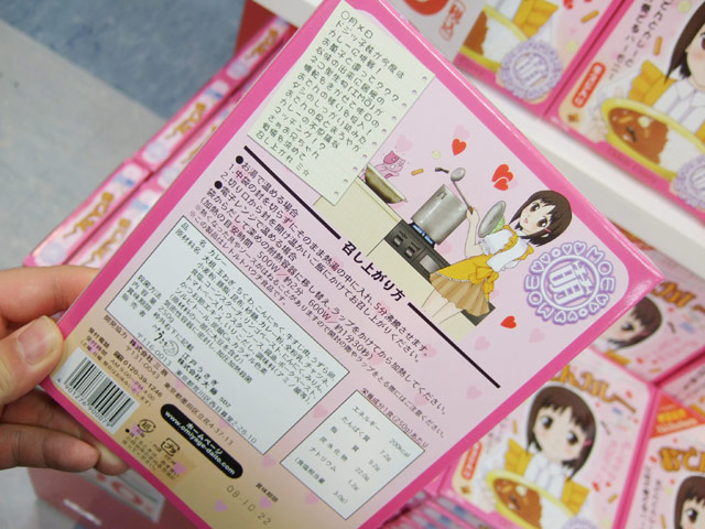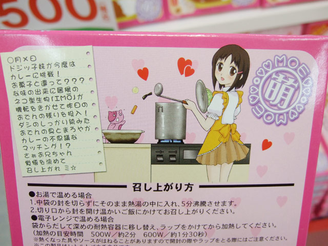 パッケ裏面によると「○月×日ドジッ子妹が今度はカレーに挑戦!お菓子と違って???の味の出来に居候のネコ型生物「IMO」が機転をきかせて昨日のおでんの残りを投入!ダシのしっかり染みたおでんの具とまろやかカレーの不思議なマッチング!?さぁお兄ちゃん覚悟を決めて召し上がれ☆」と書かれていて、どうやらホントにおでんの具でカレーを作ったものみたいです。(パッケ裏面の原材料一覧など)