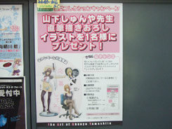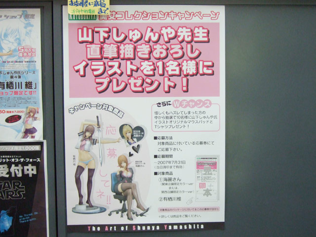 コトブキヤ秋葉原店では、コトブキヤ海麗さん(RA)や「有栖川 椎」(RA)等を購入するとついてくる応募券で応募すると、山下しゅんや氏直筆描き下ろしイラストがもらえる「美少女コレクションキャンペーン」の告知ポスターが掲示されていました。