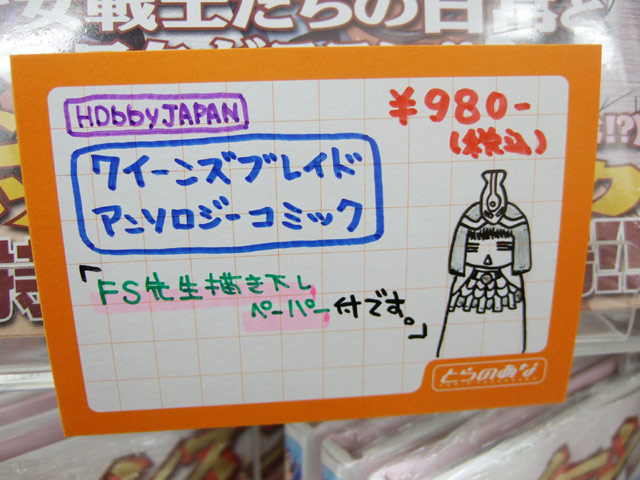 また、某店で早期販売していたのをお伝えした記事が、掲載後約2日で8万PV(画像含む)を超えている「クイーンズブレイドアンソロジーコミックス」(AA)が25日に正式な発売日を向かえ、とらのあな本店5Fでは、ヘタレPOPに「F.S先生描き下ろしペーパー付です。」として販売し、描き下ろしペーパーのサンプルも展示していました。