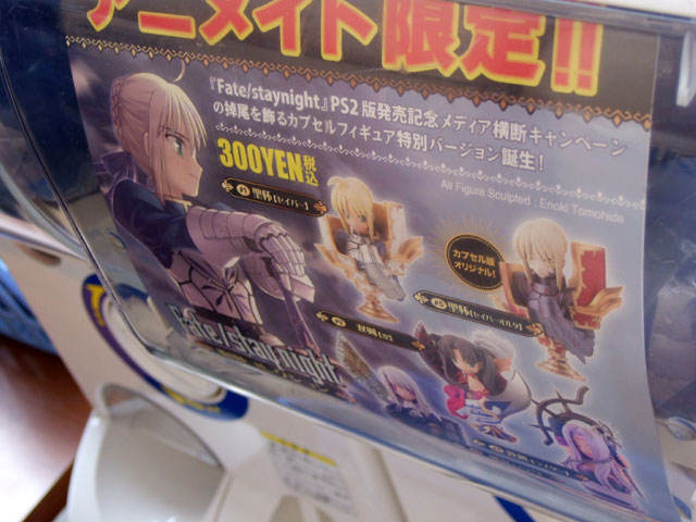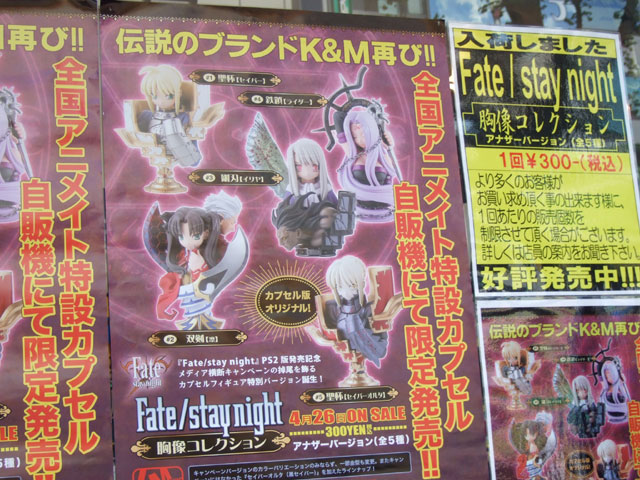 これは、掲示してあったポスターによると「伝説のブランド K&M 再び!! 全国アニメイト特設カプセル自販機にて限定発売!!Fate/stay night PS2版発売記念メディア横断キャンペーンの掉尾を飾るカプセルフィギュア特別バージョン誕生!」という「Fate胸像コレクション」のアナザーバージョン。