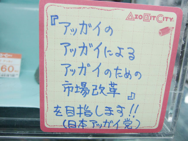 キャラシティでは、どちらのサンプルも継続して展示されていて、POPには「アッガイのアッガイによるアッガイのための市場改革を目指します!!(日本アッガイ党)」とかかれていました。