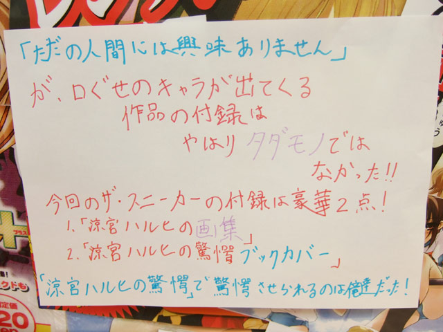 ゲーマーズでも「the Sneaker (ザ・スニーカー) 2007年 06月号」(AA)は入荷していて、POPでは『「ただの人間には興味ありません」が口ぐせのキャラが出てくる作品の付録はやはりタダモノではなかった!!「涼宮ハルヒの驚愕」で驚愕させられるのは俺たちだった!』とされていました。