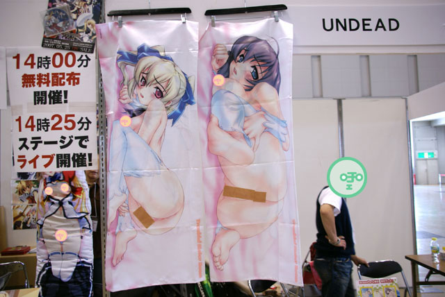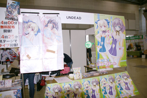 UNDEAD ブースでは他にも、ちゃんと服を着た姿のPOPと、やっぱり全裸で、しかもお尻をこちらに向けているポーズの抱き枕カバーのサンプル展示などもされていました。