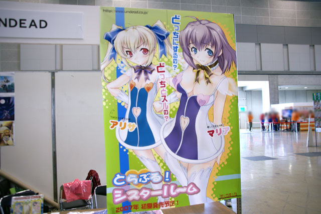 せなかblogさんが、ドリパ大阪2007春の記事で「ちゃんとモザイクあるんですけど、遠くから見たらモザイク無しに見えるんですよ」というコメントを紹介されている、一見丸裸で無修正にも見える、UNDEADブースで展示されていた「とらぶる!シスタールーム」(AA)のヒロインのアリサ、マリア姉妹の巨大裸タペストリーを紹介されています。