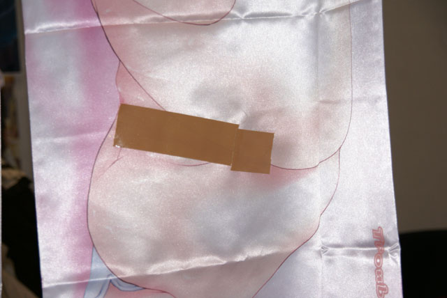 お尻をこちらに向けているポーズの抱き枕カバーは、もちろんモザイクがかかっていますが、こちらもサンプルではガムテープで股間を隠していました。