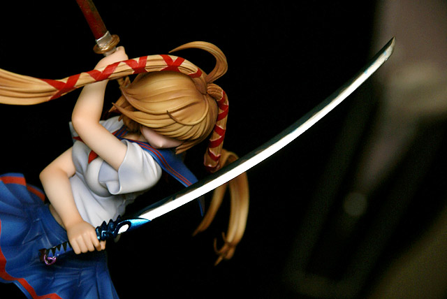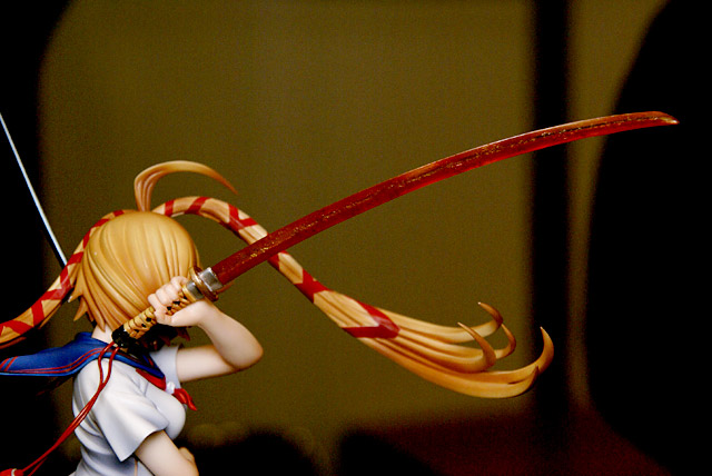 シェラキ公式の商品説明ページで『見所 1 : 2本の刀 暁の「神薙の刃」は鋭く妖しく光る、クリアー成型。「黄泉乃夢」は荒れた赤錆を造形・彩色で再現、柄頭から流れる紐にも注目。「蒼乃癒鬼」は鍔の複雑な表現をイラストそのままに立体化しています。』と紹介されているように、とても気合が入った造形となっていましたw