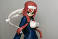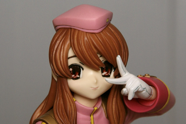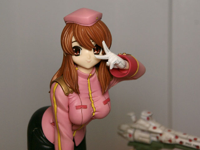 これは、アニメ「涼宮ハルヒの憂鬱」第11話「射手座の日」で登場した艦長の服姿のみくるを「ユビを眼のところでチョキにするお決まりのポーズ」で立体化したものです。