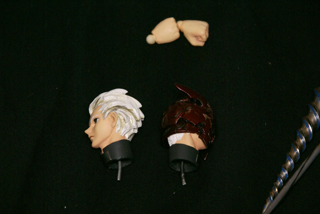 別途おかれていた、アニメ顔と思われるヘッドパーツと、かぶとを付けた状態のヘッドパーツ。