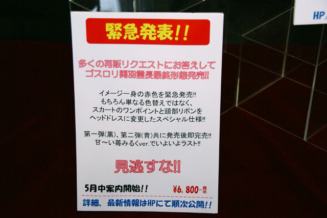 また、2006年10月に発売された「一騎当千 関羽雲長 ゴスロリ版」(AA)(参考レビュー)の「あまロリAlice Ver.」」(RA)(参考レビュー)に続くリペイント版となる「一騎当千 関羽雲長 苺みるくVer.」のキャストサンプルも展示されていました。