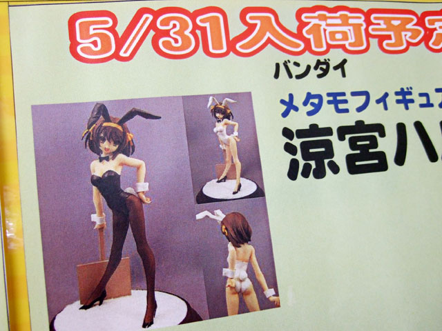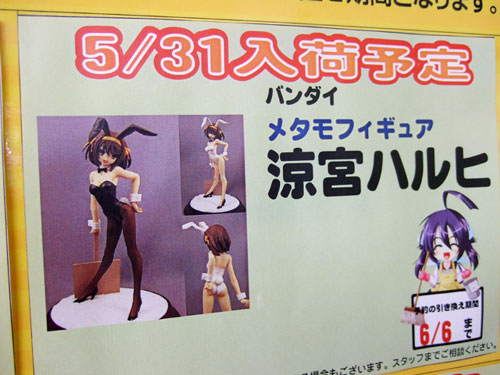 ソフマップ本店4Fのフィギュア入荷予定掲示板に、5月新作の入荷予定が掲示してました。それによると、バンダイ「メタモフィギュア 涼宮ハルヒ(バニーVer.)」(AA)は5月31日入荷予定とのことでした。