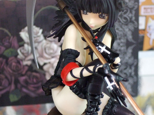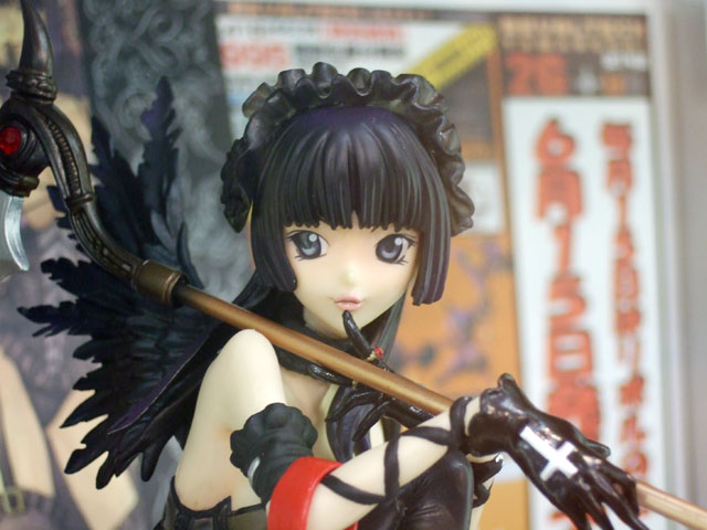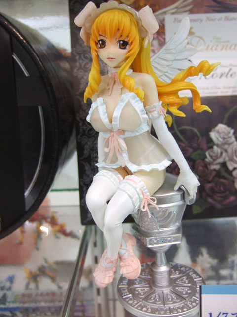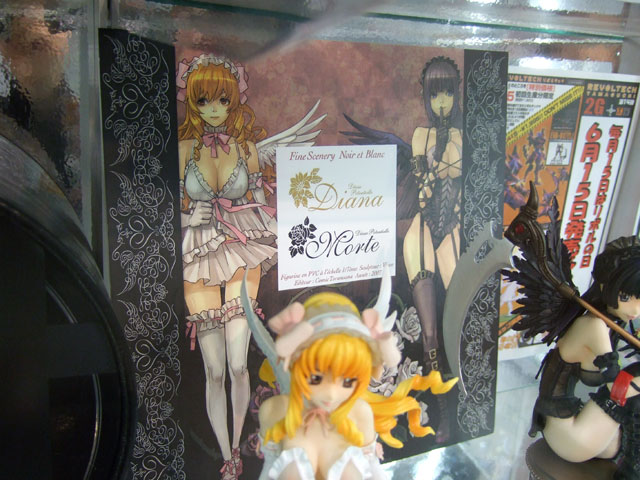 これは、WHF有明14等で展示されていた、Vispoの片桐克洋氏オリジナルデザインのガレキをPVC完成品にしたもので、とらのあなの商品説明によると「史上初かもしれないフィギュア先行コミック『Noir et Blanc(ノア・エ・ブラン)』より、「ディアナ」&「モルテ」登場です! 人気造形作家片桐克洋氏の手によるオリジナルキャラクター、黒と白をモチーフにした女神候補生ディアナとモルテが、とらのあなよりPVC塗装済み完成品フィギュアとして発売されます。白とピンクの甘ロリ衣装に身を包んだディアナ。背中の羽、宙に漂う金髪、控えめなポーズなどが彼女の持つ独特の雰囲気を漂わせています。黒いゴスロリ衣装に身を包んだモルテ。背中の黒い羽、口元に手を当てクスリと笑う様な表情、担いだ鋭利な鎌などが死神を連想させますね。どちらも露出度高めの衣装&魅惑の表情で、見るものを虜にしちゃいます!これなら女神養成所最後の課題も楽々クリア…かも??ガレージキットとして発売されたときには無かった特別な仕様も!?白をモチーフにした可憐なディアナ&黒をモチーフにした妖艶なモルテを是非お手元にどうぞ! 」と紹介されています。