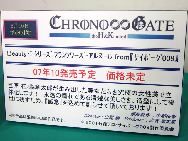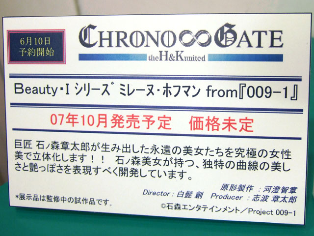 これは、ワンフェス2007冬等でも無彩色サンプル展示にあった「009-1」のヒロイン「ミレーヌ・ホフマン」を立体化したもので、POPによると「石ノ森美女が持つ、独特の曲線の美しさと艶っぽさを表現すべく開発しています。」と紹介されています。
