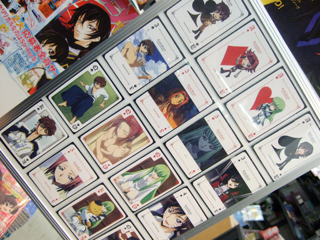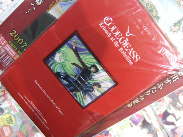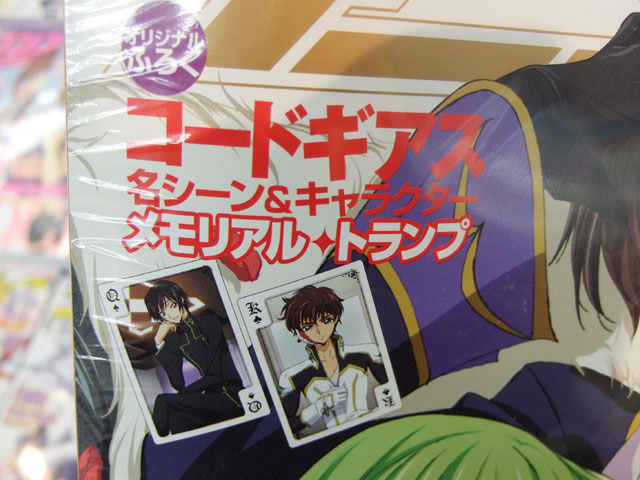 5月10日、第29回 アニメグランプリ結果発表も掲載されている「アニメージュ 2007年 06月号」(AA)が発売されました。今回の付録は「コードギアス名シーン&キャラクターメモリアルトランプ」となっていて、ゲーマーズ本店では「全力でトランプだ」としていくつかの絵柄を展示していました。それによると絵柄の中には、カレンのシャワーシーンC.Cのハダワイ姿などもw