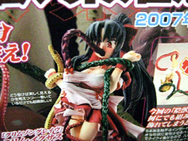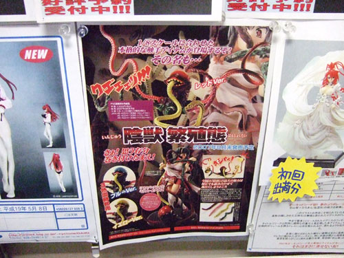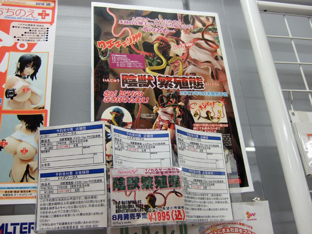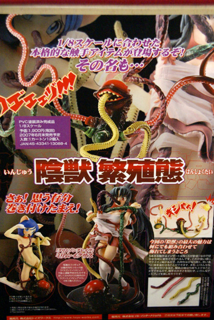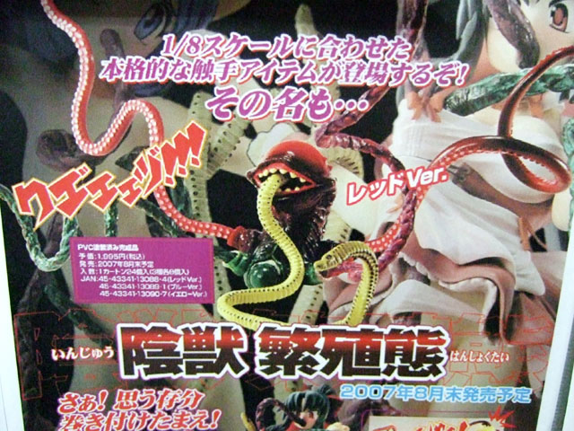 コトブキヤ秋葉原店とらのあな本店にて、トイズワークス陰獣 繁殖態」(AM)のPOPの掲示と予約受付が開始しています。これは、5本ある触手がインサート成型(芯が針金)で自由に動かせるもので、掲示されていたPOPは、以前宮沢模型展示会2007春でも掲示されていた、ドラゴンエイジピュア誌上通販品「ミリムフィギュア」を使用例(?)として掲載したものw エロス