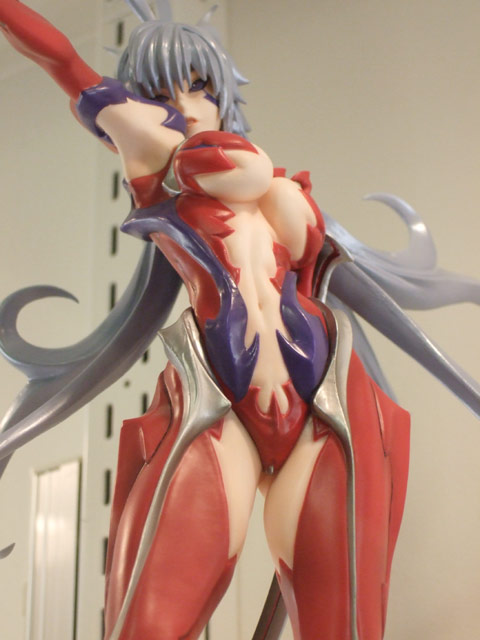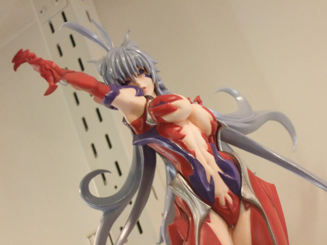 これは、以前、ワンフェス2007冬の会場でサンプルを撮影させていただいたこともある、アニメ「ウィッチブレイド」の雅音の、物語後半のボディーにフィットしたスタイリッシュな赤い装甲のパワーアップした変身姿を、DVD解禁バージョンの生足スタイルで立体化したもので、コトブキヤの商品説明によると「2006年放映全米が嫉妬する、セクシーアクション作品「ウィッチブレイド」より物語後半のパワーアップした雅音の登場です。以前のスタイルから一変、赤を貴重にスタイルの良い体にまとう装甲が彼女の強さを表しています。今回もテレビ放映版ではなく、DVD収録版のスタイルで立体化です。迫力のサイズと均整のとれたスタイルをお楽しみ下さい。」と紹介されています。