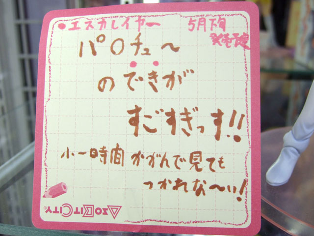 アルター「超昂天使エスカレイヤー エスカレイヤー」(RA)のサンプル展示が、17日からキャラシティで開始していました。そのサンプルのPOPには、「パ○チュ〜のできがすごすぎっす!!小一時間かがんで見てもつかれな〜い!」と書かれ、いつもの展示位置より前のほうに置かれていた感じでした。せっかくなのでパンツを確認したところ、確かにすごいことにw