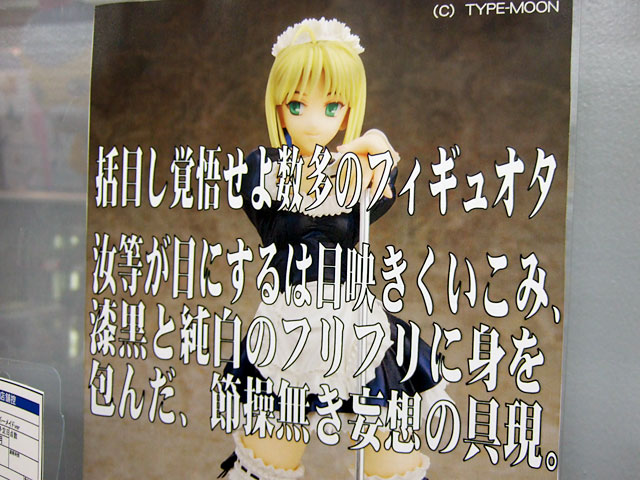 以前、アキバでの予約状況をお伝えしたように、アキバのいくつかのホビーショップでは、アルターFate/hollow ataraxia セイバー メイド ver」(AA)の予約受付が開始しています。とらのあな本店では「括目し覚悟せよ数多のフィギュオタ 汝等が目にするは目映きくいこみ、漆黒と純白フリフリに身を包んだ、節操無き妄想の具現。」というPOPが新たに追加されていました。