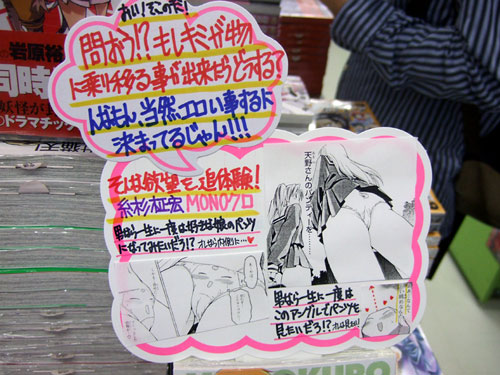 メロンブックスのPOPでは、コミックのいくつかのシーンを掲載し「問おう!?もしキミが物に乗り移ることが出来たらどうする?んなもん、当然エロい事するに決まってるじゃん!!!」「それは欲望を追体験! 糸杉柾宏MONOクロ 男らは一生に一度は好きな娘のパンツになってみたいだろ!? オレなら内側に・・・♥」「 男なら一生に一度はこのアングルでパンツを見たいだろ!?オレは見たい!」等とかかれていました。