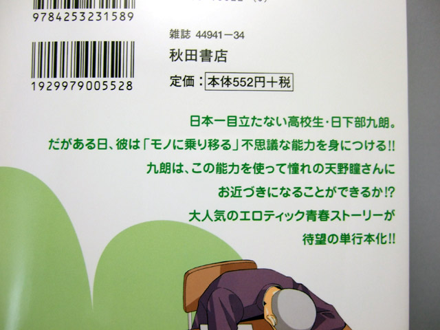 これは、裏表紙によると「日本一目立たない高校生・日下部九朗。 だがある日、彼は「モノに乗り移る」不思議な能力を身につける!!九朗は、この能力を使って憧れの天野瞳さんにお近づきになることができるか!?大人気のエロティック青春ストーリーが待望の単行本化!!」と紹介されている、チャンピオンREDにて連載されていた、全年齢向けマンガ。