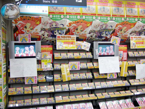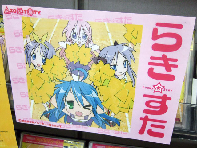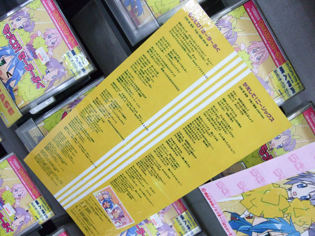 公式での発売日は5月23日で、アキバでは22日頃から発売されるらしい、アニメ「らき☆すた」OP曲 「もってけ!セーラーふく」(AA)の販売用の展開が、ゲームシティで22日には開始されていて、パッケサンプルや、秋葉原blogさんで、とらでの掲示で歌詞ほぼ確定>記事差し替えでゲーマーズでの掲示で歌詞確定をお伝えされている、歌詞カードなどの掲示もされてました。