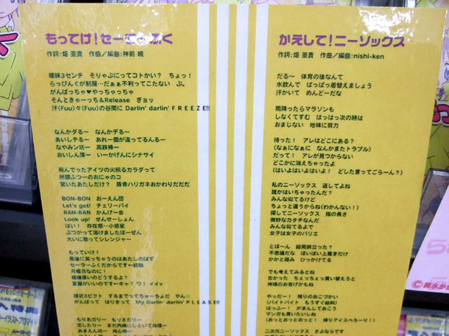 公式での発売日は5月23日で、アキバでは22日頃から発売されるらしい、アニメ「らき☆すた」OP曲 「もってけ!セーラーふく」(AA)の販売用の展開が、ゲームシティで22日には開始されていて、パッケサンプルや、秋葉原blogさんで、とらでの歌詞掲示>記事差し替えでゲーマーズでの歌詞掲示をお伝えされている、歌詞カードなどの展示もされてました。