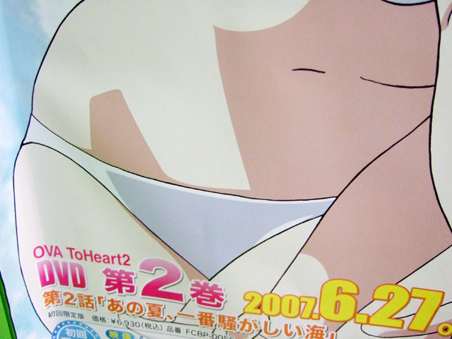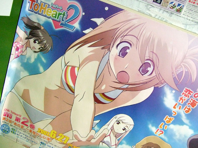 ゲームシティで発売時「イルファさんをただの3P要員だと思っていた昨日までの自分は死んだ!」とされていた「第1巻」(AA)に続き、6月27日発売予定のOVA「ToHeart2 第2巻」(AA)の告知ポスターがヤマギワソフト本店にて掲示開始されていました。告知ポスターには、いいんちょの水着姿が一番大きく描かれていました。他、タマ姉、このみ、るーこ、いくのんの水着姿も。