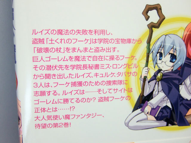 裏表紙によると2巻のお話の内容は「ルイズの魔法の失敗を利用し、盗賊「土くれのフーケ」は学院の宝物庫から「破壊の杖」をまんまと盗み出す。巨人ゴーレムを魔法で自在に操るフーケ。その潜伏先を学院長秘書ミス・ロングビルから聞き出したルイズ、キュルケ、タバサの3人は、フーケ捕獲のための捜索隊に志願する。ルイズは――そしてサイトはゴーレムに勝てるのか? 盗賊フーケの正体とは……!?」という部分まで。