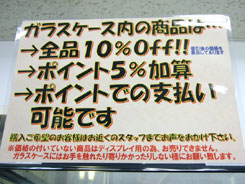 価格などは、ショウケースの上に取り付けられたPOPによると「ガラスケース内の商品は・・・→全品10%Off!!(値引き後の価格を表示してあります) →ポイント5%加算 →ポイントでの支払い可能です」とのこと。