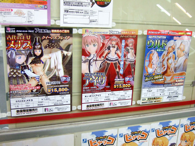 なお、K-BOOKSの店頭壁面には、以前からメガハウス「コードギアス 反逆のルルーシュ ギアス占い」(AM)や「攻殻機動隊 Perfect Piece タチコマンズ タチイエロー」(AA)、グリフォンエンタープライズ「一騎当千 孫策伯符 体操着Ver.」(ガレキサンプル)、「クイーンズブレイド 古代の女王メナス」(AA)、「クイーンズブレイド 冥土へ誘うものアイリ」(AA)、「ああっ女神さまっ ウルド」(AA)等のPOPが掲示されていましたが、この辺も入荷予定とのことでした。ただし、取り扱う絶対数はまだ少なめとのことなので、今後出る全てのフィギュアが入荷するわけではないみたいです。