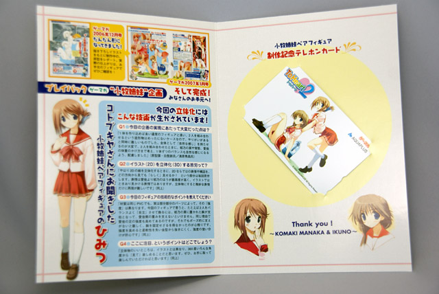 SBCrショップの商品説明によると「手にしたみなさんからとても大きな反響をいただいた、前回のタマ姉企画(参考レビュー)からさらにクオリティを越えようと、いろいろな「チャレンジ」をした今回のフィギュア化計画……ついにめでたく完成!お姉ちゃんである愛佳と「AnotherDays」でヒロイン昇格を果たした郁乃をひとあし早くPVCフィギュアに!今回もキャラクターデザイン担当甘露樹さんのオリジナルデザイン画をもとに立体化!キュートな2人の魅力をギュギュッと凝縮!」と紹介されています。