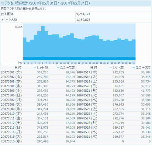 総ヒット数は974万4171。総ユニーク数は115万9878でした。トップページへのアクセス169万3757PV。(内、新環境トップは166万7386、旧ライブドアブログトップは2万6371)