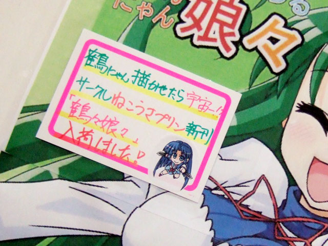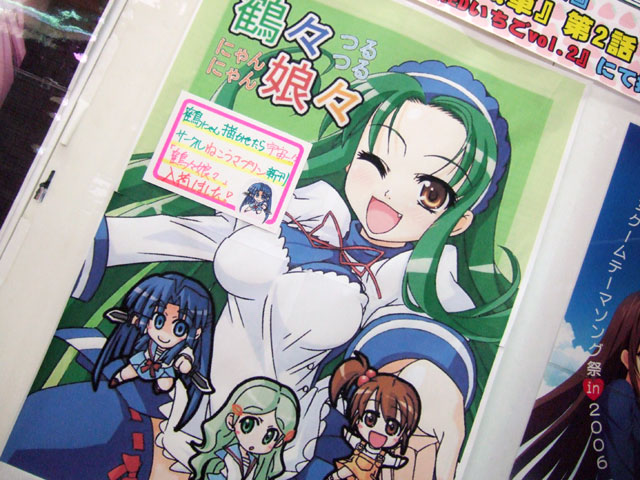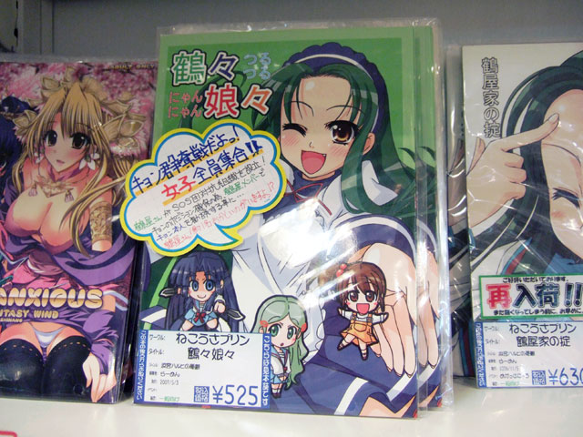 6月1日、5月3日に開催された都産祭の参加イベント「ラノベまにあっくす」にて頒布された、らーめん氏のサークルねこうさプリンの同人誌「鶴々娘々」がアキバで発売されました。これは、鶴屋さんが立ち上げた反SOS団組織「めがっさにょろにょろ団」にキョンを勧誘しようとする一般向けギャグ同人誌。メロンブックスでは「鶴にゃん描かせたら宇宙一!?」というPOPも掲示。