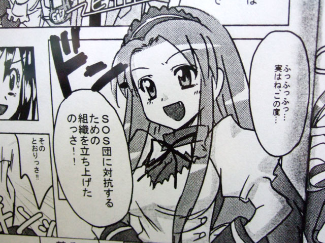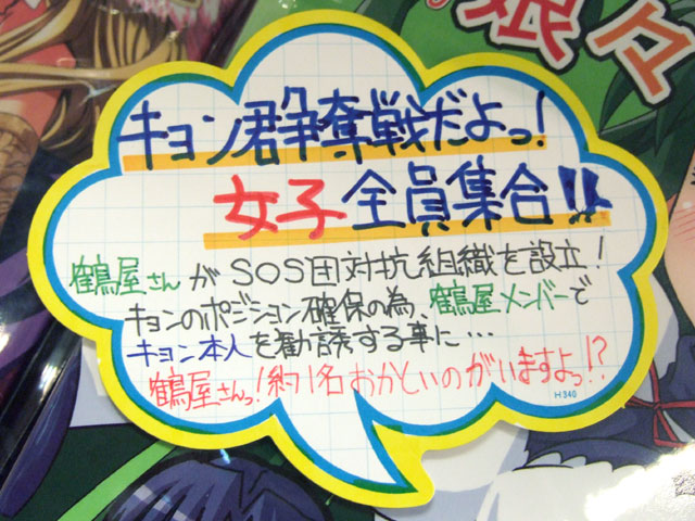 メッセサンオー3号店でも入荷していて、POPでは「キョン君争奪戦だよっ!女子全員集合!! 鶴屋さんがSOS団対抗組織を設立!キョンのポジション確保の為、鶴屋メンバーでキョン本人を勧誘する事に・・・鶴屋さんっ!約1名おかしいのがいますよっ!?」と書かれていました。