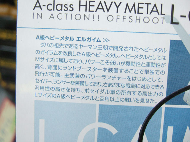 これは、パッケの機体解説によると「A級ヘビーメタル エルガイム ダバの祖先であるヤーマン王朝で開発されたヘビーメタルのガイラムを改良したA級ヘビーメタル。ヘビーメタルとしてはMサイズに属しており、パワーこそ低いが機動性と運動性が高く、背面にランドブースターを装備することで単独での飛行が可能。主武装のパワーランチャーをはじめとして、セイバー、ランサーを装備しており、さまざまな戦局に対応できる汎用性の高さを持ち、ポセイダル軍の所有する高出力のLサイズのA級ヘビーメタルと互角以上の戦いを見せた。」と紹介されている、、アニメ「重戦機エルガイム」の初期の主人公機である「エルガイム」を立体化したもので、GA Graphicの紹介記事によると「モビルスーツ以外のロボットを続々アクションフィギュア化」という「IN ACTION!! OFFSHOOTシリーズ」の第1弾となるものです。