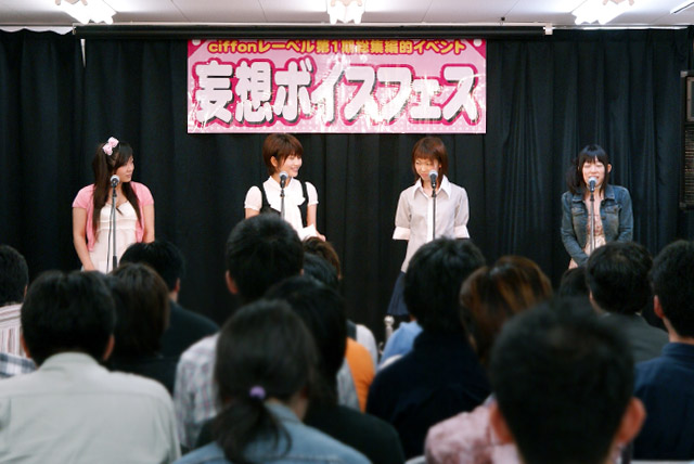 「妄想ボイスフェス」は、妄想妄想VoiceCDに出演されている声優さん達の生告白、生罵声、生『おにぃちゃん』等が聞けるということで、整理券配布が早々に終了してしまい 急遽追加公演が決定されたというイベントです。