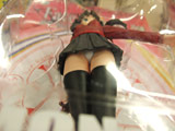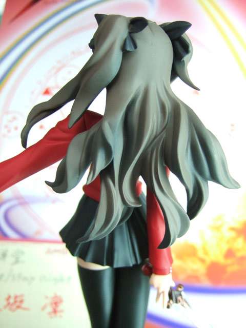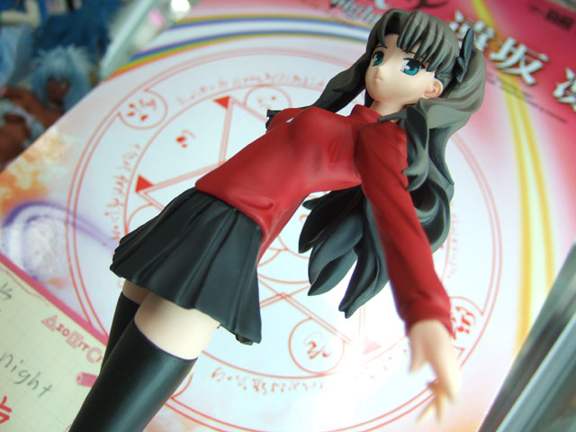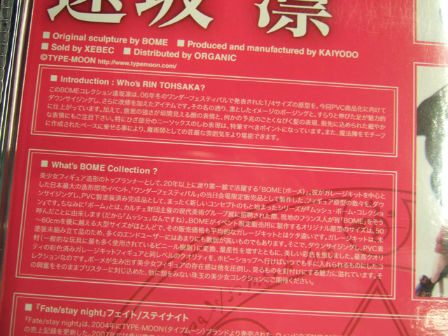 これは、以前サンプルを撮影させて頂いたこともある、BOME氏原型のフィギュアコレクションの「BOMEコレクション」の第22弾となるもので、パッケ裏面の解説によると「このBOMEコレクション遠坂凛は、06年冬のワンダーフェスティバルで発表された1/4サイズの原型を、今回PVC商品化に向けてダウンサイジングし、さらに改修を加えたアイテムです。その名の通り、凛としたイメージのポージングと、すらりと伸びた足が魅力的に仕上がっています。加えて、意思の強さが垣間見える顔の表情と、何かの予兆のごとくなびく髪の表現、指先に込められた細やかな表情にもご注目下さい。特にひざ部分のニーソックスのしわ表現は、特筆すべきポイントになっています。また、魔法陣をモチーフに作成されたベースに乗せる事により、魔術師としての荘厳な雰囲気をより堪能できます。」と紹介されています。