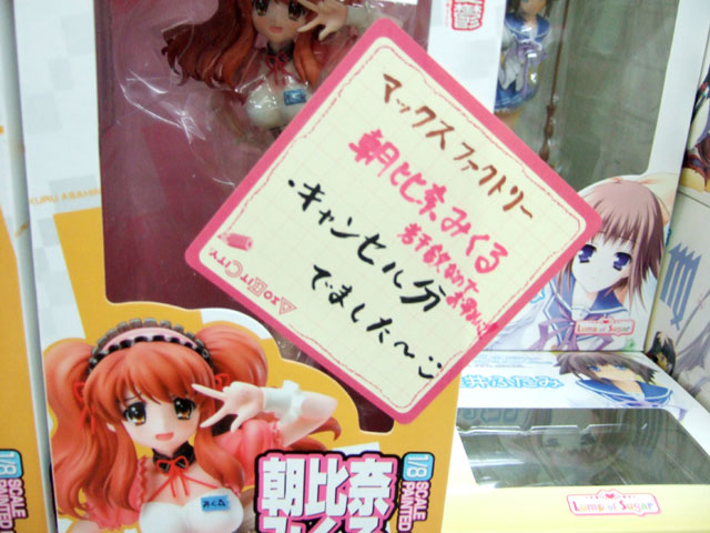 6月2日のアキバでの在庫状況をお伝えした際には、ほとんど完売状態となっていた、マックスファクトリー「涼宮ハルヒの憂鬱 朝比奈みくる」(AM)ですが、キャラシティで「キャンセル分でました〜」として販売されていました。