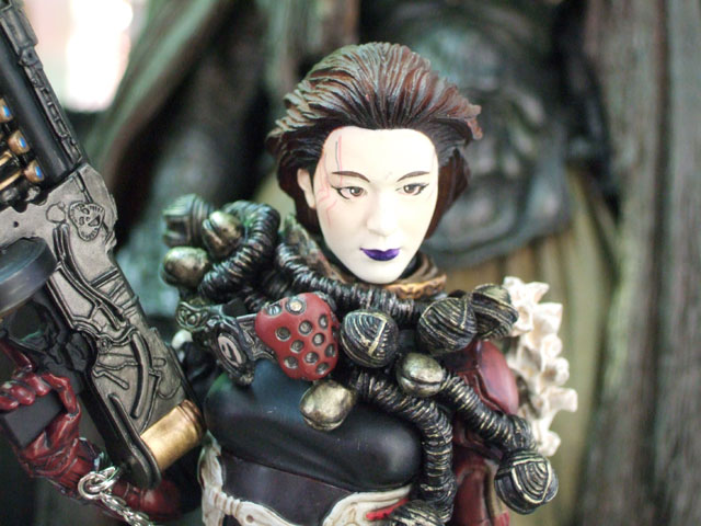 「イリアは、ゼイラムと戦うバウンティハンター。このフィギュアは、竹谷氏が雑誌で発表したワンオフ作品を雛形としています。クールなヒロインのイメージはそのままに、エスニック調のアレンジを加え、映像とはかなり印象の違うものに昇華された姿は、ワイルドな風貌と相まって、独自の世界観を強く醸し出しています。PVC製塗装済み完成品として発売するにあたり、原型をダウンサイジングし、より造形の密度を高めました。このサイズでは他に類を見ない精巧なディテールを持つ、彫像となっています。ぜひ「ゼイラム」とあわせてお買い求め下さい。」