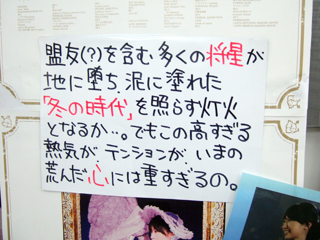 ゲームシティのPOPでは「盟友(?)を含む多くの将星が地に堕ち、泥に塗れた「冬の時代」を照らす灯火となるが・・・。でもこの高すぎる熱気が、テンションが、いまの荒んだ心には重すぎるの。」と書かれていました。