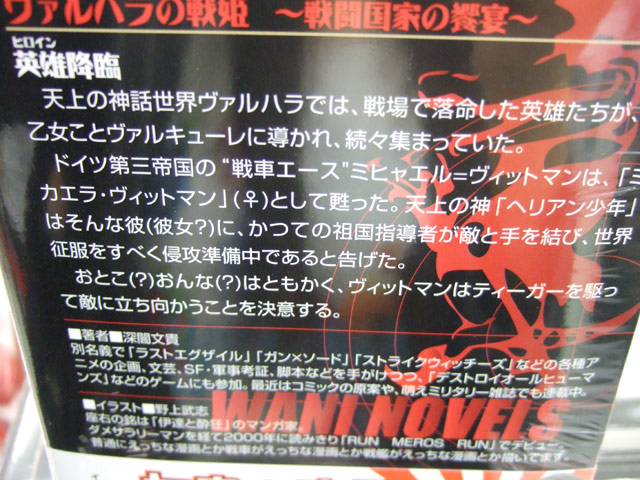 これは、「MC☆あくしず」「萌えよ!戦車学校」等でも知られる、KKベストセラーズの商品説明では「普通にえっちな漫画とか戦車がえっちな漫画とか戦艦がえっちな漫画とか描いてます。」とい紹介されている、野上武志氏がイラストを担当された、KKベストセラーズの商品説明によると『天上の神話世界ヴァルハラでは、戦場で落命した英雄たちが、戦乙女ことヴァルキューレに導かれ、続々集まっていた。ドイツ第三帝国の“戦車エース”ミヒャエル=ヴィットマンは、「ミカエラ・ヴィットマン」(♀)として甦った。天上の神「ヘリアン少年」はそんな彼(彼女?)に、かつての祖国指導者が敵と手を結び、世界征服をすべく侵攻準備中であると告げた。おとこ(?)おんな(?)はともかく、ヴィットマンはティーガーを駆って敵に立ち向かうことを決意する。 』という内容の小説です。
