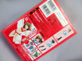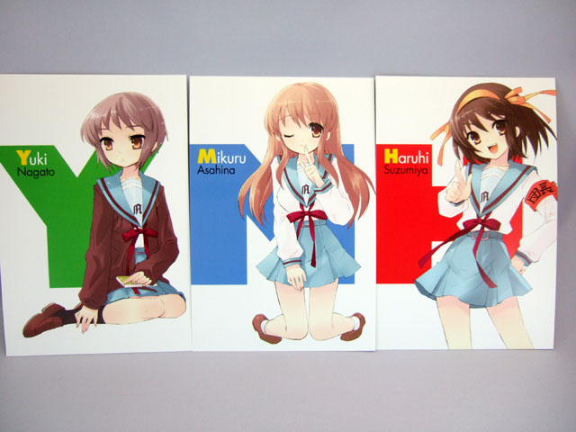 これは、ブクロBlogさんの記事でハルヒの水着姿が眩しい・・・とされていた、水着姿のハルヒイラストのオリジナルカバーのコミックス第4巻(画像中央右)、涼宮ハルヒフィギュア、いとうのいぢ氏イラストの3人娘(ハルヒ、長門、みくる)3種のポストカード(画像右)がセットになったもの。