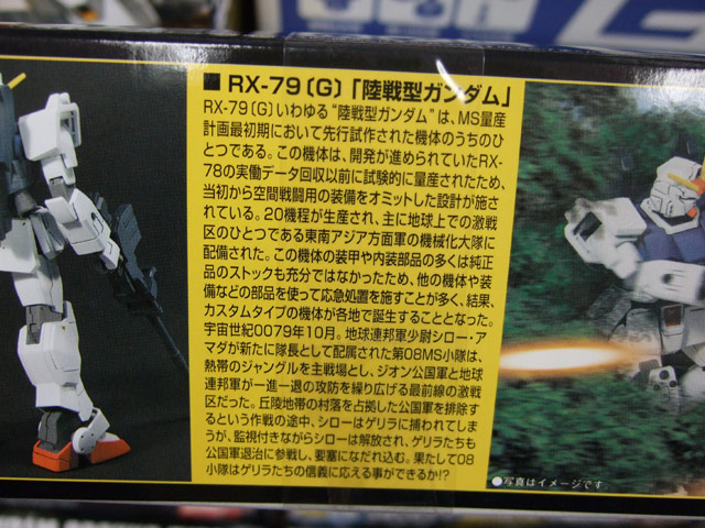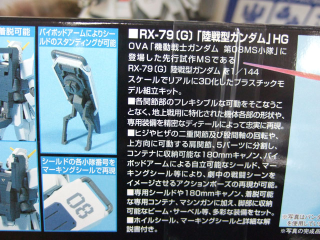 これは、アニメ「機動戦士ガンダム 第08MS小隊」に登場する「陸戦型ガンダム」をプラモデルで立体化したもので、パッケ側面の解説によると