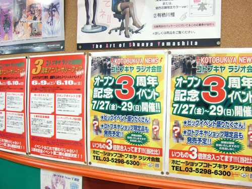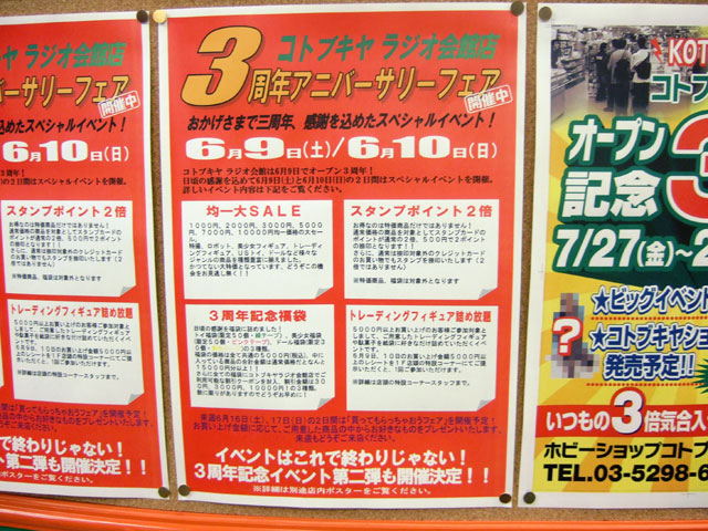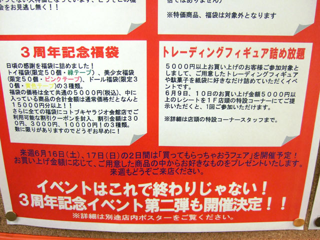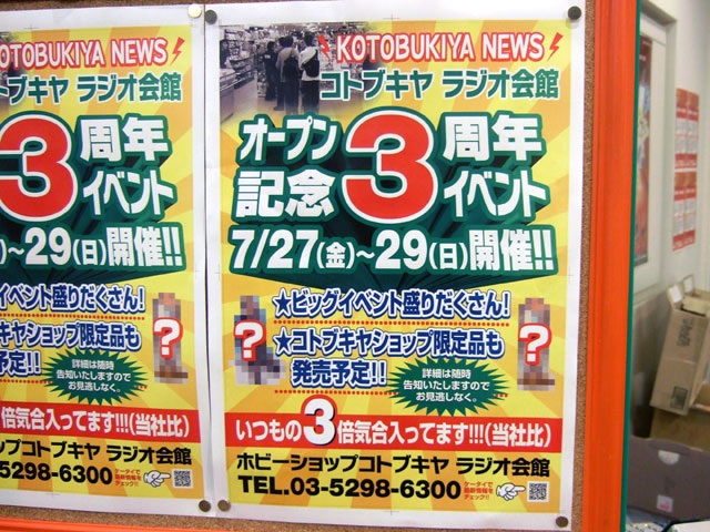 6月9日〜10日の2日間、コトブキヤラジオ会館にて、オープン3周年を記念した「3周年アニバーサリーフェア」が開始されます。フェア内容は、1000円〜10000円くらいまでの均一価格セール、スタンプポイント捺印2倍、5000円で販売されるトイ、ドール、美少女の3種類の福袋、トレーディングフィギュアつめ放題などです。画像は7月に開催予定の3周年記念イベントの告知。