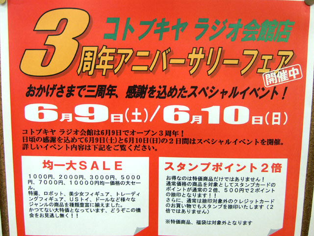 6月9日〜10日の2日間、コトブキヤラジオ会館にて、オープン3周年を記念した「3周年アニバーサリーフェア」が開始されます。