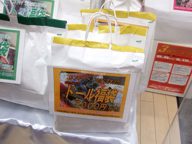 掲示されていたPOPによると、フェア内容は、1000円〜10000円くらいまでの均一価格セール、スタンプポイント捺印2倍、15000円以上のものが入っているという、トイ、ドール、美少女の3種類の福袋の5000円での販売、期間中、5000円以上購入した方を対象とした、トレーディングフィギュアつめ放題などです。
