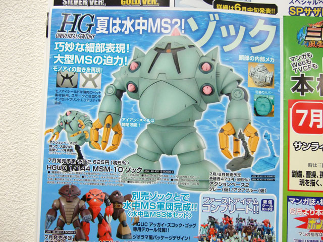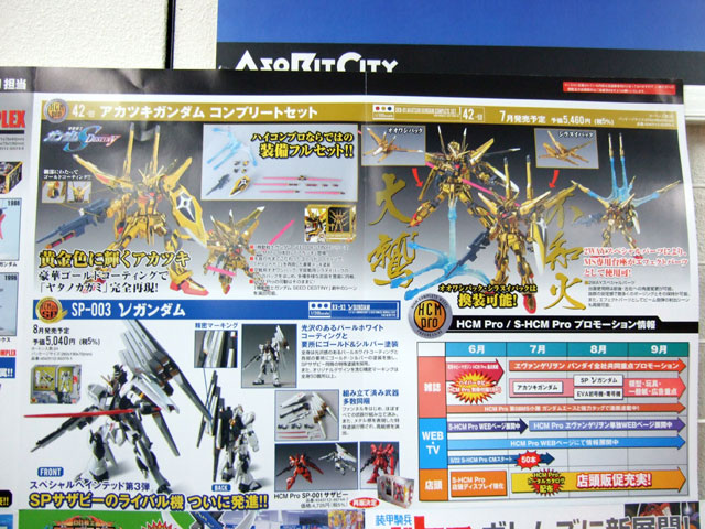 キャラシティにて、毎月恒例となっている、バンダイのガンダムもの+αの新作告知POPの掲示が開始していました。今回は7/8/9月分となり「MG 1/100 ターンエーガンダム」(AA)、「HGUC 1/144 MSM-10 ゾック」(AA)、「HGUC 1/144 ブルーディスティニー1号機」(AA)、「HCM Pro 第42弾 アカツキガンダム コンプリートセット」(AM)等、シリーズがばらけた感じが印象的。