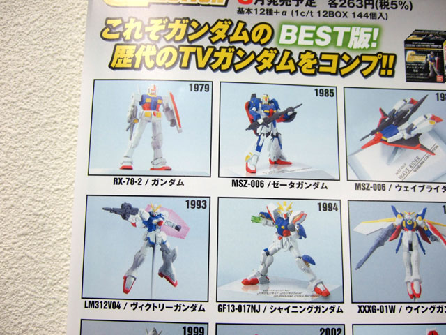 ガンダム、Zガンダム、ウェイブライダー、ZZガンダム、Vガンダム、シャイニングガンダム、Wガンダム、ガンダムX、∀ガンダム、エールストライクガンダム、フォースストライクガンダムの12種+シークレットで、1BOX12個入り。