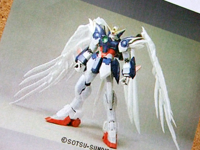 「アニメ『新機動戦記ガンダムW Endless Waltz』に登場する「ウイングガンダムゼロカスタム」のプラモデル。煌びやかな羽をイメージさせるように特殊加工を施し質感を追求している。ボディ外装部はパールメタリック使用。特徴的な大羽はハーフクリア、ピンクパールコーティング塗装で虹色に。羽先端の小羽根にはピンクパールを施し、大羽と同様の表現を採用。アンテナなどの黄色部分にはゴールドEXF加工、靴先などの赤い部分はレッドパールEXF加工でそれぞれ独特の質感を表現。骨組み本体は通常ABSグレー。羽に使用するビスカラーはシルバーを採用。」